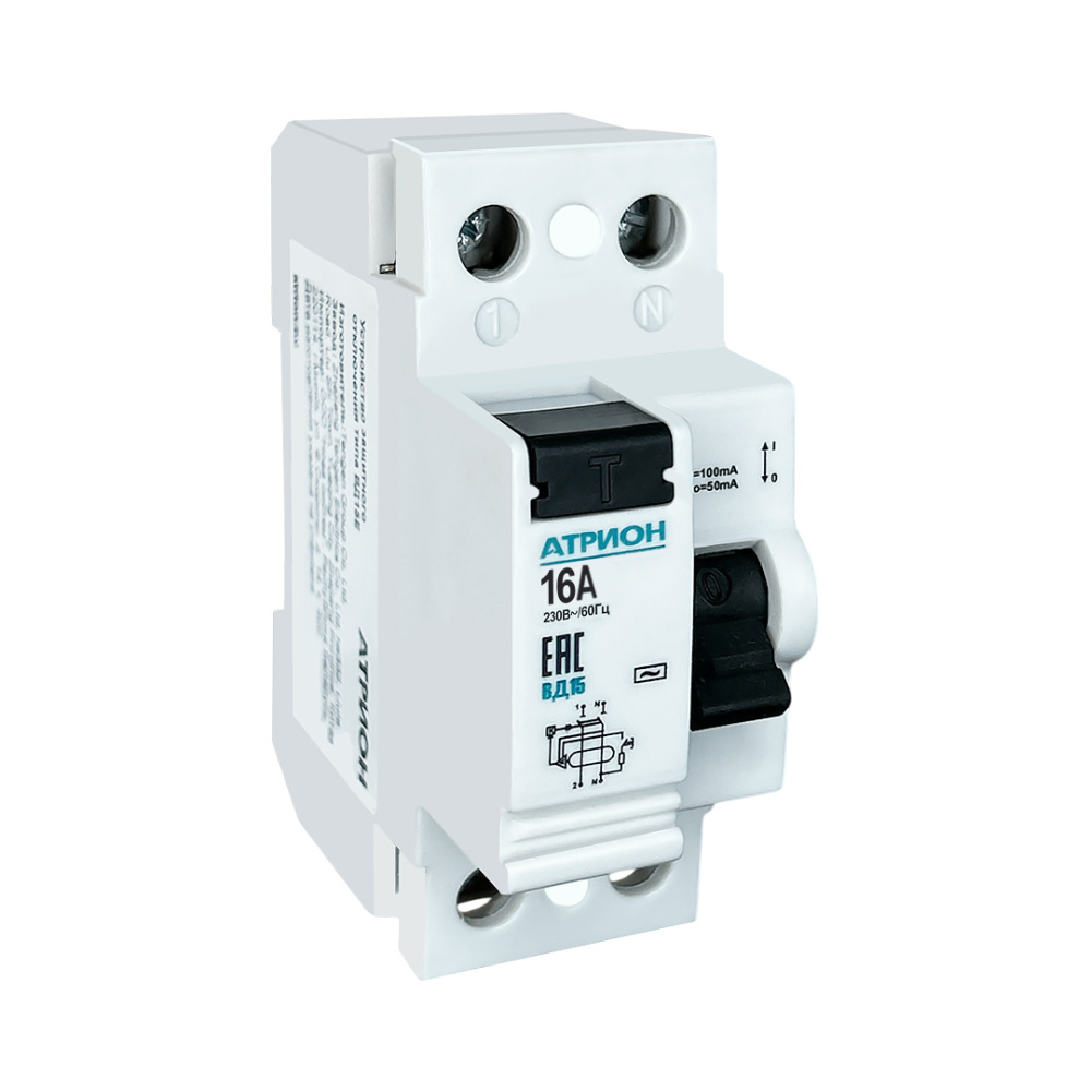 - Устройство защитного отключения АТРИОН ВД15Е, 2P, 16A, 4.5kA, 10mA, тип AC, 2M, Арт. VD15-2-16-10