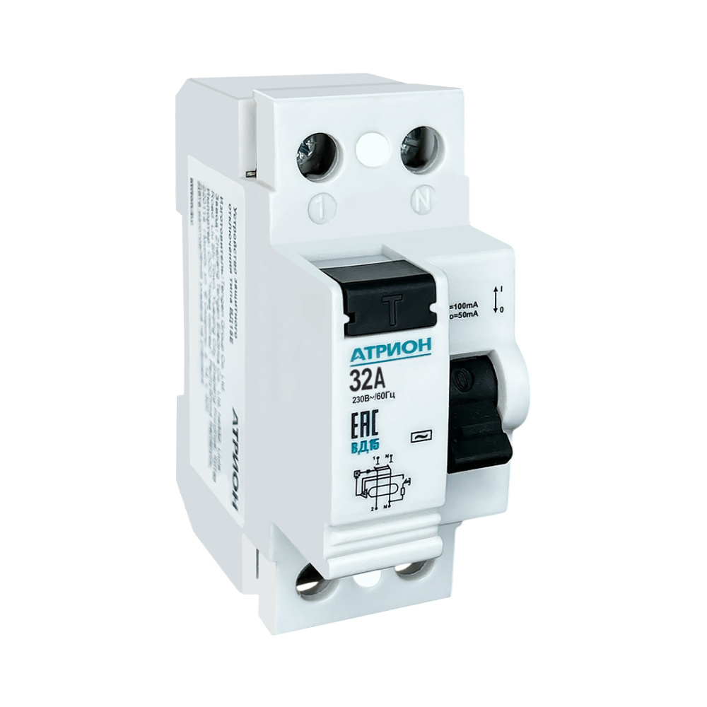 - Устройство защитного отключения АТРИОН ВД15Е, 2P, 32A, 4.5kA, 30mA, тип AC, 2M, Арт. VD15-2-32-30