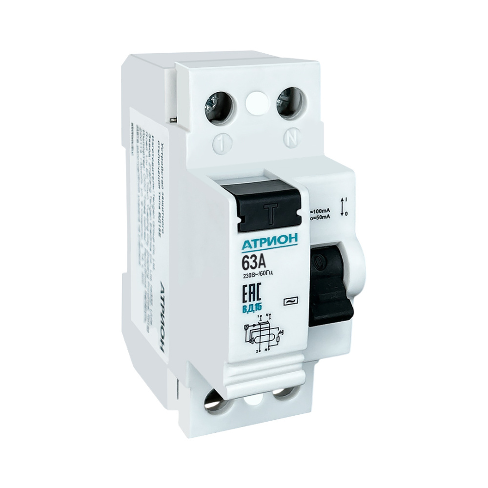 - Устройство защитного отключения АТРИОН ВД15Е, 2P, 63A, 4.5kA, 30mA, тип AC, 2M, Арт. VD15-2-63-30