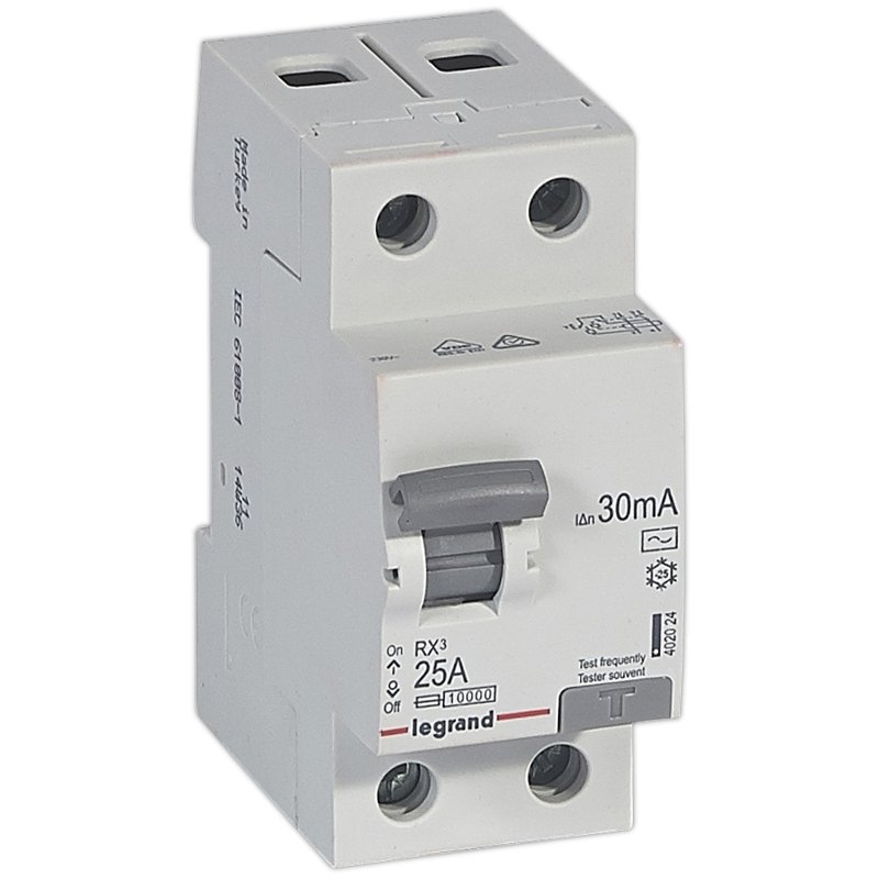 - УЗО Legrand RX3, электромеханическое, 2P, 25A, 10kA, 30mA, тип AC, 2M, Арт. 402024